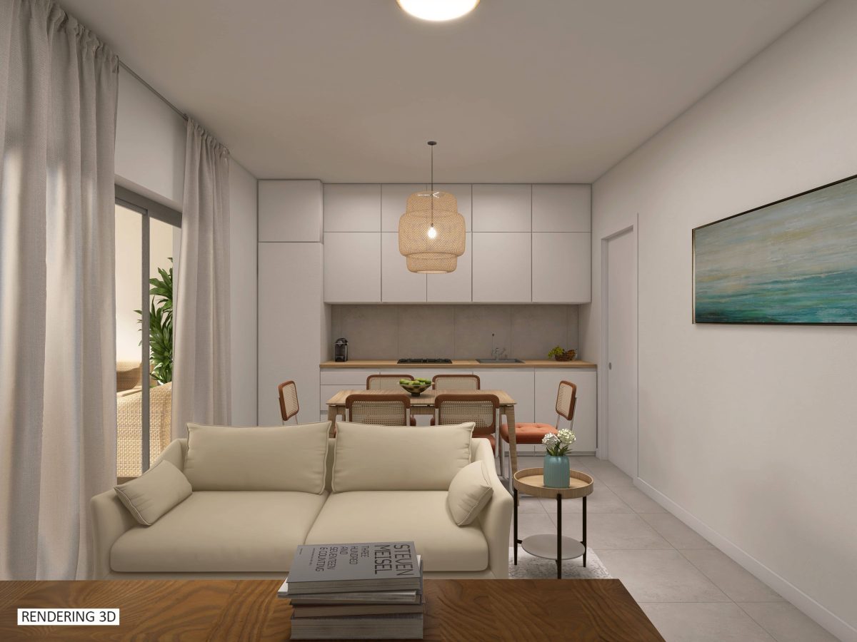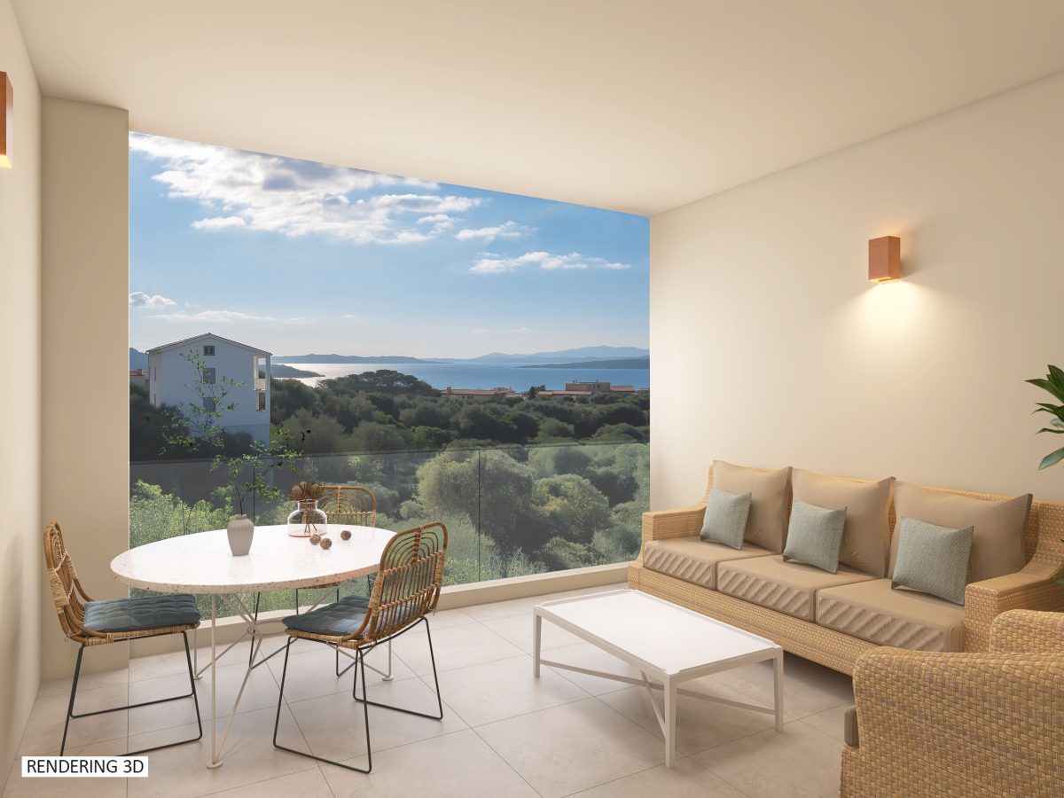 L’ampia terrazza panoramica esposta a est cattura i primi raggi del sole sull’arcipelago, mentre gli spazi sapientemente distribuiti del bilocale con loggia coperta offrono quella flessibilità che distingue le proprietà di carattere.